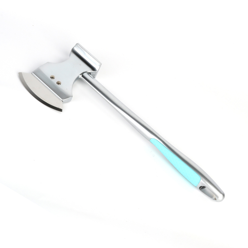 Bladet til pizzakutteren er laget av høykvalitets 304 rustfritt stål, og designet er inspirert av formen til en øks, noe som gir det et mer praktisk og visuelt tiltalende utseende. Verktøyet er av moderat vekt, noe som gjør det enkelt å bruke og allsidig i funksjonene. Enten det brukes som kjøttmørner eller til å kutte pizza, kan bladet også brukes til å fjerne kjøtt og fruktkniv. grønnsaker og frukt når ingen andre kniver er tilgjengelige.