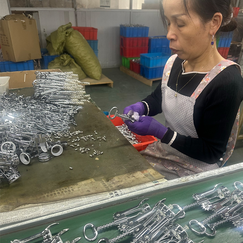 Hele korketrekkeren har nådd sin endelige prosess, som er montering. Først klassifiserer vi alle bearbeidede halvfabrikata deler etter komponenttype. Kvalitetskontroll (QC) personell gjennomfører foreløpige inspeksjoner for å bekrefte at disse halvfabrikata oppfyller alle produktspesifikasjoner for funksjonalitet, farge og overflatekvalitet. Kvalifiserte og defekte deler blir deretter levert separat. Produksjonsavdeling og lageravdeling. Etter den etablerte produktspesifikasjonsmanualen lagres kvalifiserte halvfabrikata på lager og går deretter inn i produksjonslinjen for montering.