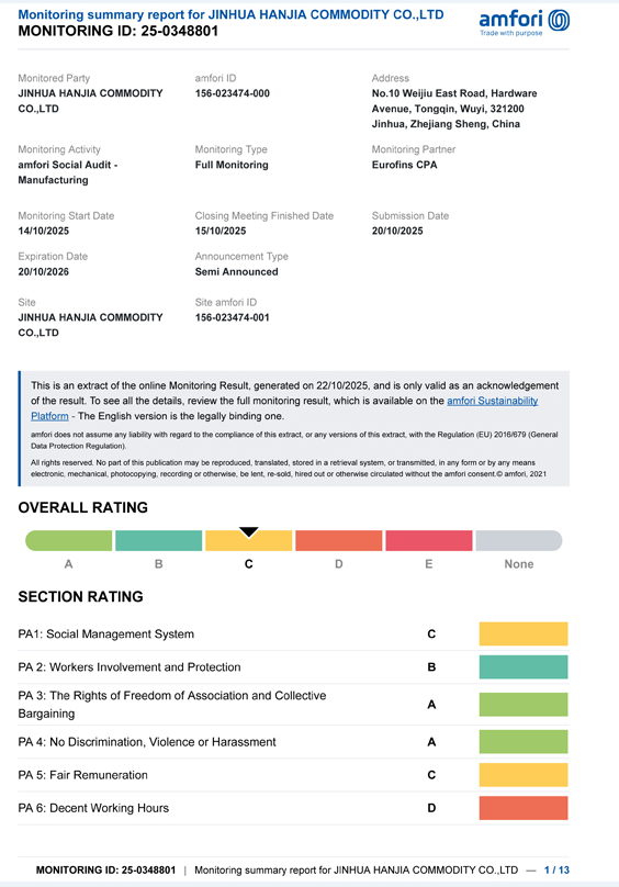 Jinhua Hanjia commodity Co., Ltd. har offentliggjort resultatene av sin BSCI-revisjon. Den 14. oktober besto selskapet den profesjonelle evalueringen og oppnådde en klasse C-sertifisering, som oppfyller minimumskravet spesifisert av kunden. Gyldighetsperioden for denne sertifiseringen er ett år. BSCI-revisjonen ble utført av EUROFINS-innkjøpsselskapet som har blitt valgt av vin, som har blitt valgt av kunden. rustfrie stålprodukter som cocktailshaker fra vårt firma i lang tid. Kundens land krever at leverandører har denne sertifiseringen.