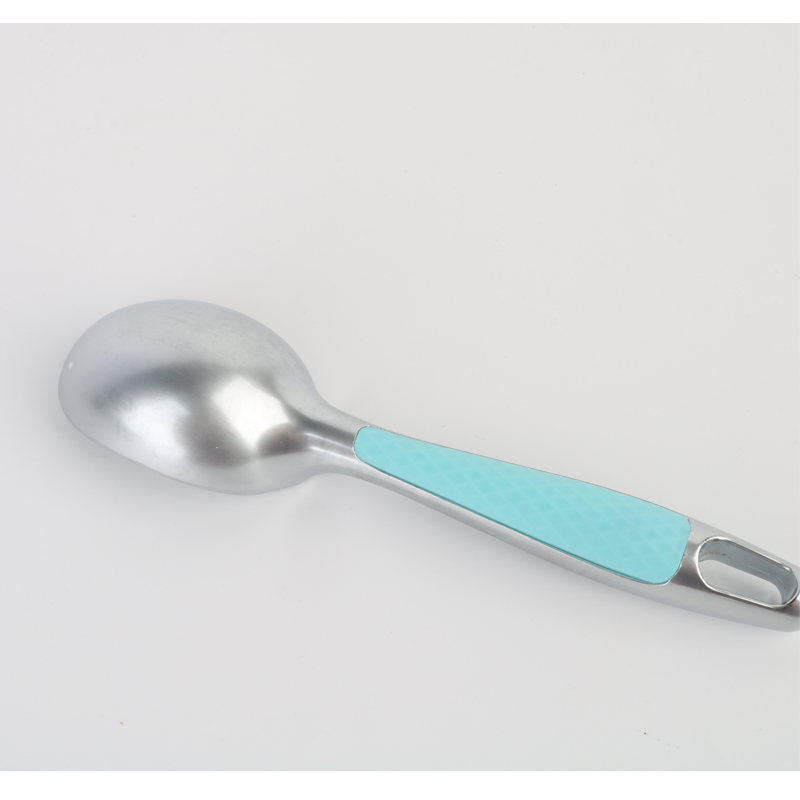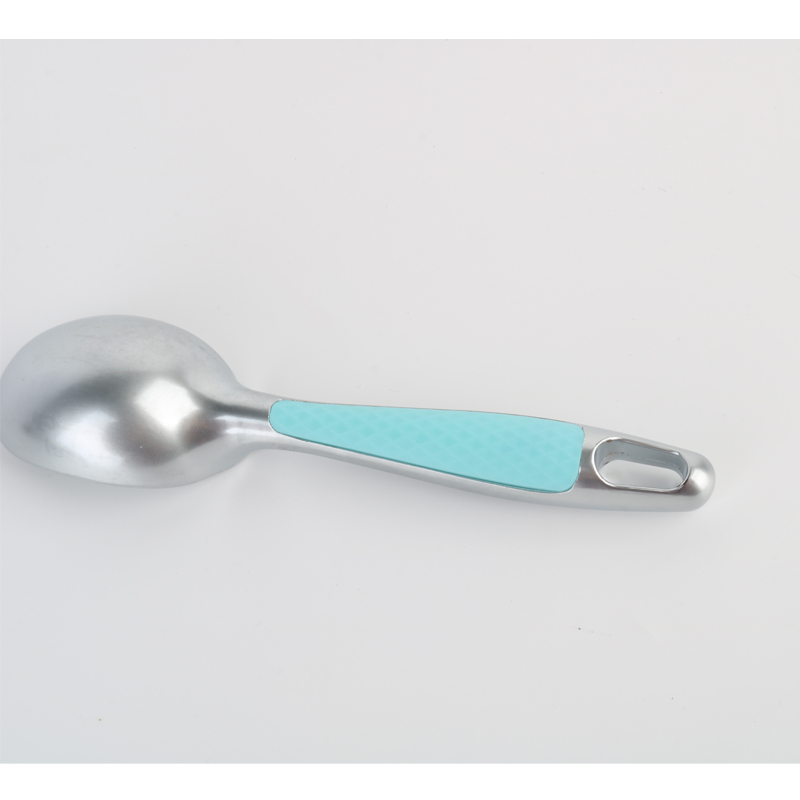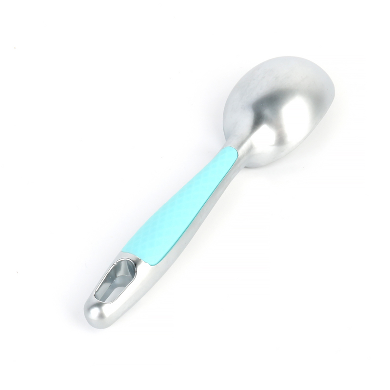 Den profesjonelle iskremskålen av sinklegering med komfortabelt grep som tåler oppvaskmaskin, unikt polstret, sklisikkert plasthåndtak er plassert på baksiden av produktet, spesielt utformet for optimalt grep når du bruker det omvendte grepet med fire fingre. Som vist i produktillustrasjonene har håndtaket et strukturert overflatemønster som sikrer sikker håndtering samtidig som det reduserer brukeropplevelsen, men ikke bare forbedrer trøtthet i hånden. kombinerer praktisk med elegant håndverk i alle detaljer.